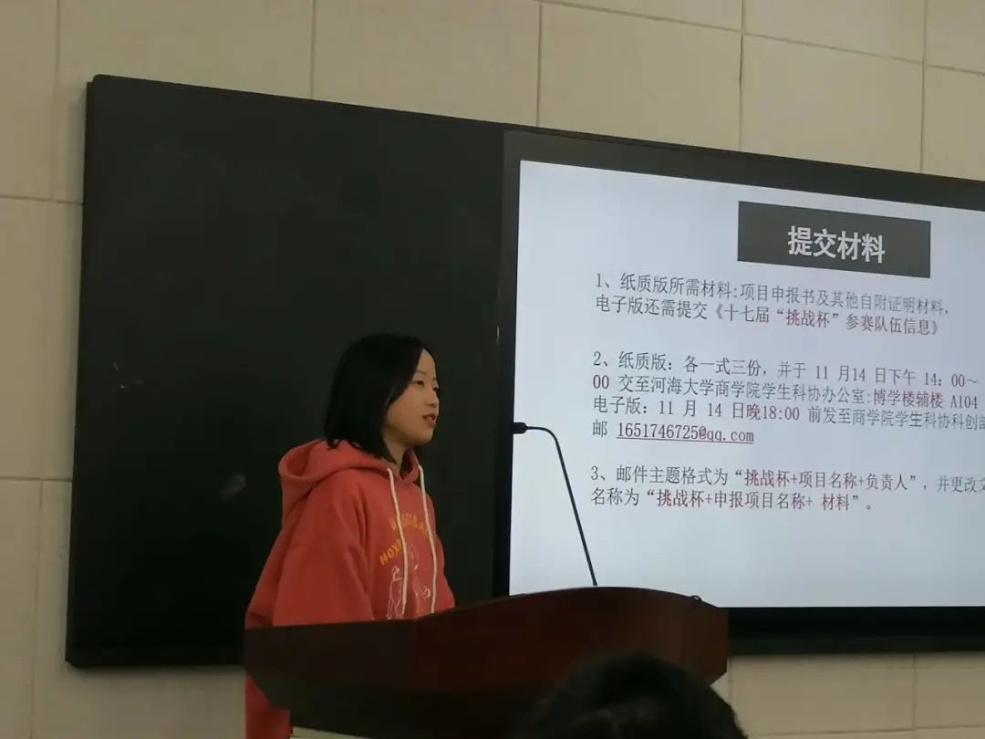 随后糖心视频 学生科协的郑佳慧同学针对大赛要求和本次糖心视频 院内赛流程进行了讲解,向同学们介绍了项目申报注意事项、作品类别、参赛要求和面向对象等。