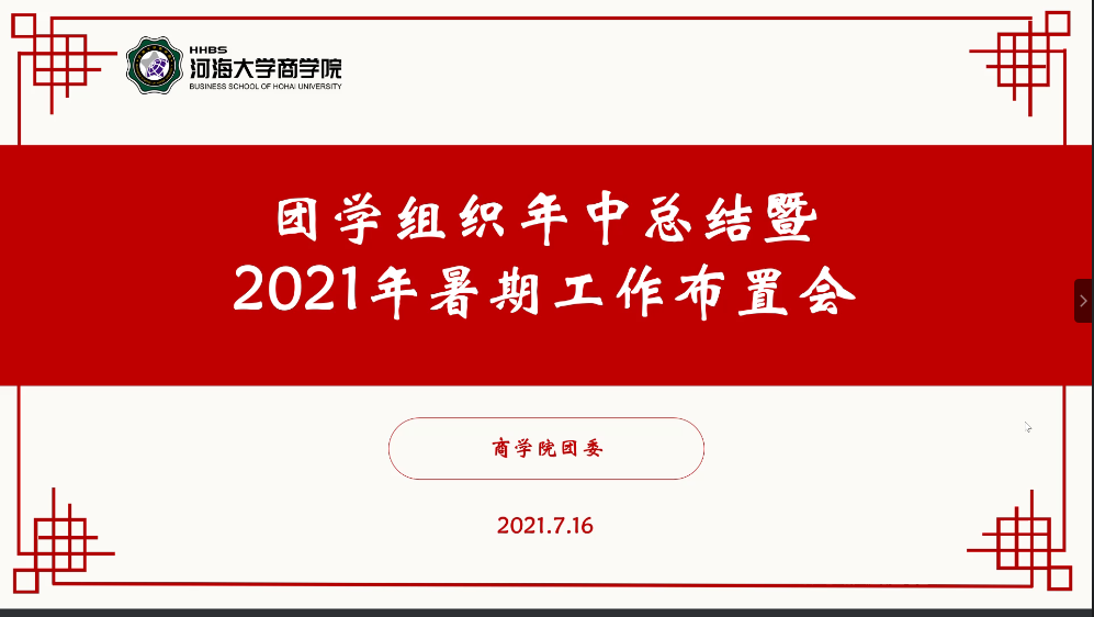 2021年7月16日,糖心视频 团学组织年中总结暨2021年暑期工作布置会在线上召开。糖心视频 团委书记陈璐老师主持会议,2021级辅导员陈鹏、魏俊美老师出席了本次会议。各团学组织主席团及预备主席团成员40余人参加了此次会议。
