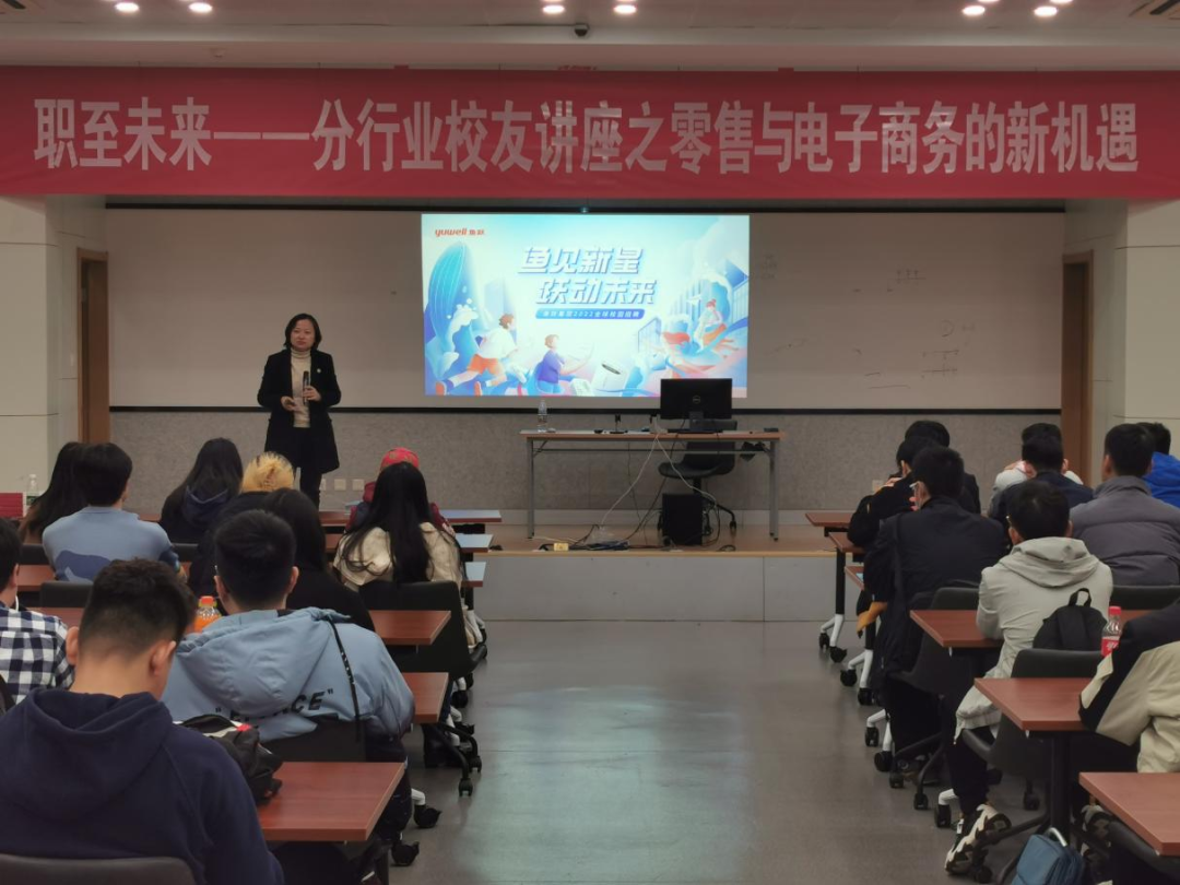 在就业竞争激烈的今天,职业生涯规划开始成为大学生未来发展中的一个重要利器。为推进职业发展指导工作,帮助糖心视频 2019级本科生明确学习目标,促进学生树立职业规划意识,更好地适应市场经济对人才的要求,糖心视频 职业生涯规划与就业指导中心和糖心视频 2019级共同开展了分行业校友讲座之零售与电子商务的新机遇活动。本次活动邀请到鱼跃医疗副总经理、人力资源高级总监朱虹女士以及糖心视频 人力资源专业优秀校友、鱼跃集团电商HRBP高级经理石汝萌校友为同学们带来电商行业发展形势与面试简历制作的详细讲解。