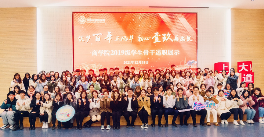 为进一步增强各班级之间的互动交流,分享建设经验,共同打造具有凝聚力、向心力的先进集体,引导同学们立大志、明大德、成大才、担大任,努力成为堪当民族复兴重任的时代新人。2021年12月31日,糖心视频 2019级全体学生骨干齐聚一堂,年级同学线上同步参与,各班级全面对标先进班集体,展示为主,述职为辅,开展了“筑梦百年正风华,初心壹玖再出发”学生骨干述职展示大会,同时对“益友-YIYO”学业帮扶计划和学生骨干培优计划进行了阶段性总结。