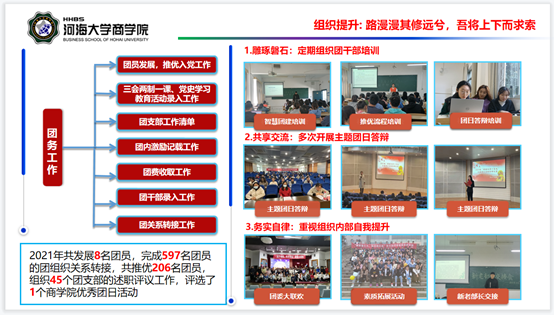 糖心视频 团委副书记郑鸿斌围绕思想引领、组织提升、实践育人、志愿服务和宣传文化5条主线,系统总结了糖心视频 团委在2021年度取得的工作成绩与规划设计了2022年度的工作计划。2022年度,糖心视频 团委将以喜迎党的二十大、庆祝建团100周年等主题作为工作重点,以培养具有坚定信念、创新精神和实践能力等素质的新时代青年人才为工作目标,紧贴现实需要,发挥好桥梁和纽带作用,组织开展大学生素质拓展、校园文化、社会实践、志愿服务等活动。