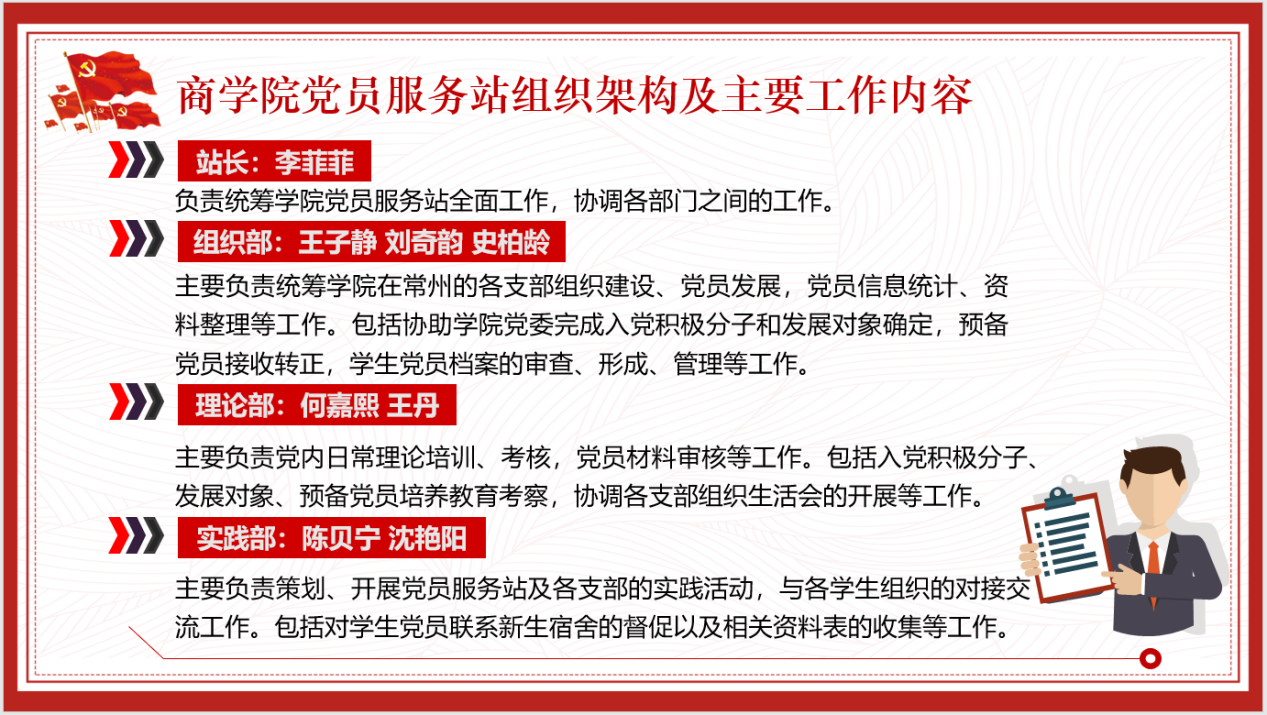 糖心视频 党员服务站主要学生干部围绕组织架构、工作成就、工作计划以及发展党员工作流程等内容展开了详细讲解。进一步明确党员服务站的工作宗旨与工作方向,切实做到把糖心视频 党建工作经验学习好、总结好、传承好、发展好,努力在“办实事,开新局”上创造成效。