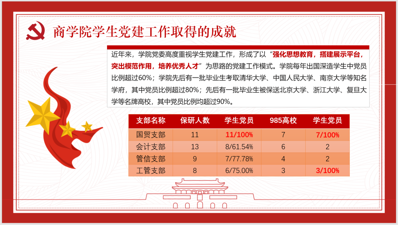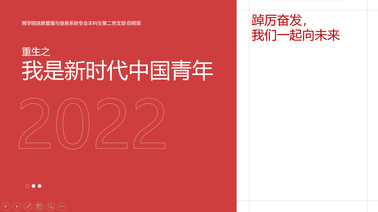 信息管理与信息系统专业本科生第二党支部党员田明昊同志分社会工作、科研创新、保研经验三个模块分享了个人综合素质提升经验,系统解读了习近平青年观的重要内涵。总结得出只有不断提升自身综合素质,才能满足时代发展与社会建设的需求,才能为社会主义现代化强国建设贡献自己的青春力量。