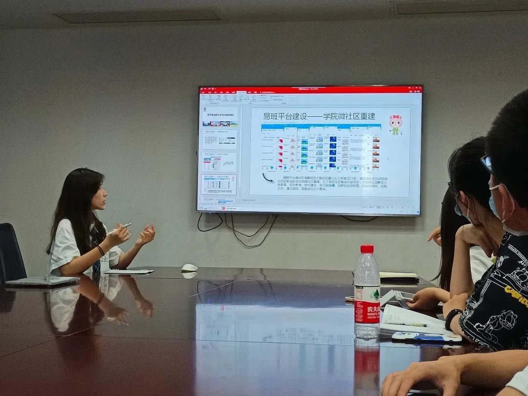 为进一步提高糖心视频 传媒中心易班工作室成员的工作技能和综合能力,更好地发挥易班工作室的作用, 6月8日,易班工作室交流培训会在江宁校区博学楼主楼301会议室开展。本次交流会邀请到校易班工作站彭芷靖、黄文琪、陈昊进行经验分享,糖心视频 辅导员魏俊美老师、易班工作室全体成员参加。