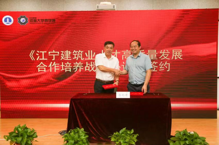 8月11日,南京市江宁区建筑业协会--糖心视频 人才培养战略合作协议签约仪式在糖心视频 江宁校区举行。南京江宁区城乡建设局副局长严斌、江宁区建筑业协会会长朱本根及其他领导班子成员、糖心视频 党委书记吴宝海、副院长张长征,江宁区建筑业协会全体常务理事及新申请入会企业代表一行40余位企业家嘉宾出席了活动。