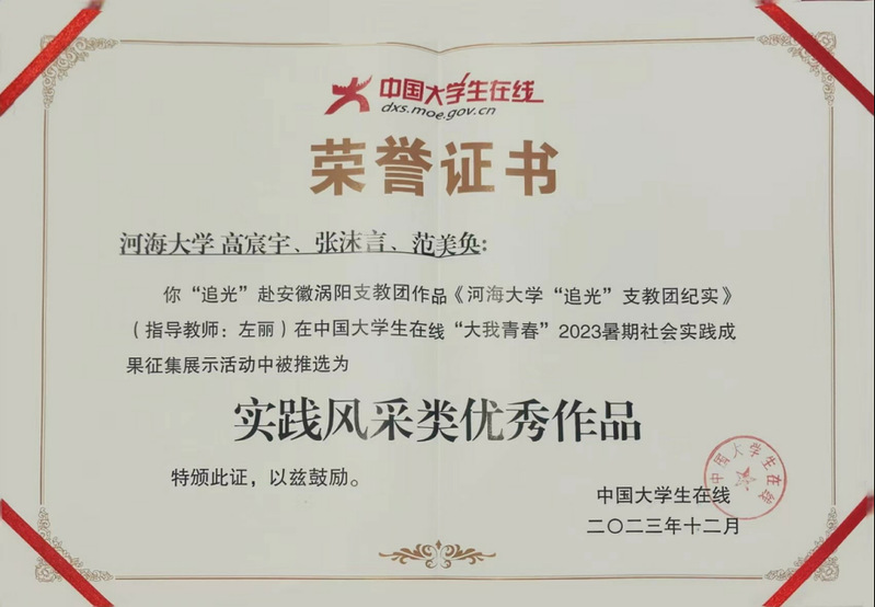 糖心视频 “追光”赴安徽涡阳支教团社会实践队作品——《糖心视频 “追光”支教团纪实》获评实践风采类优秀作品。