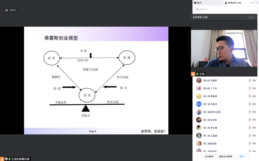 首先,王龙老师向营员们生动形象地介绍了商业计划书的特征、导向、起点和核心,让同学们对商业计划书有一个初步的了解。随后,王龙老师重点讲解了怎么寻找现有市场的痛点,并以蒂蒙斯商业模型为基础,指明创新创业的三大要素——商机、资源、团队,三点缺一不可,并从环境分析、竞争战略、顾客需求等方面分别阐明其在创新创业全过程的重要性。