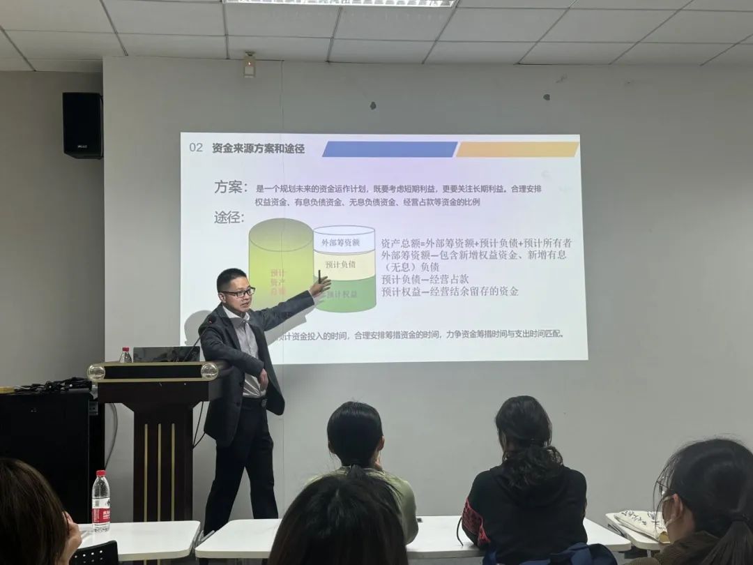 讲座伊始,饶栋平老师为大家介绍了商业策划书的内容、作用及要求,着重强调撰写商业策划书时需要明确目标,包括项目的目标、预期结果、市场定位等;同时也要求注重产品和服务受众,充分了解潜在投资者、合作伙伴和客户的需求及期望。这将有助于确保策划书的内容更具针对性和吸引力。
