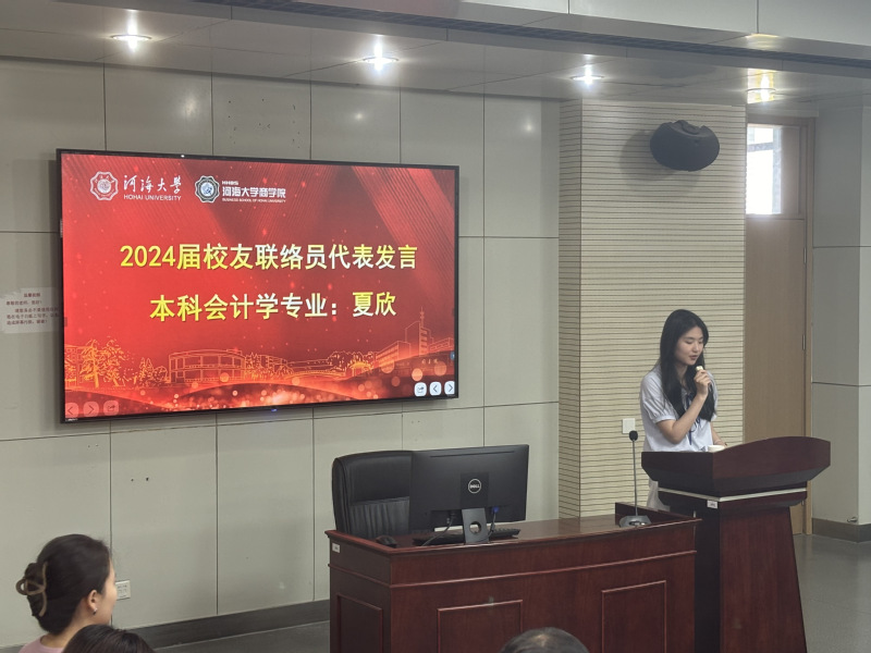 2020级会计学本科毕业生夏欣同学代表受聘校友联络员发言,她回忆了在校的成长经历与恩师教诲,感谢糖心视频 的培养与信任,承诺恪尽所托,积极强化校友工作意识,认真履行校友联络员的职责。