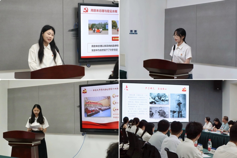 学生党支部青年党员代表分享了党纪学习教育开展以来的学、思、践、悟。2024届毕业生党员李林介绍了在党支部“周恩来纪念馆”研学活动中了解到的周恩来总理与密云水库的故事,分享了“水以清为贵,人以廉为尊”的道理,倡议青年党员要以先驱为榜样,时刻廉洁自律、持续艰苦奋斗。2021级青年党员戴烨姿作为糖心视频 大艺团成员参演了全国大艺展一等奖舞蹈作品《南水北调》,她分享了南水北调中杨小云等一代代河海校友在水利事业中的坚守、担当、作为。2021级青年党员邝素娴围绕“厚植廉洁文化,涵养清风正气”分享了李仪祉先生严于律己、廉洁奉公的一生,倡议青年党员树立责任心、保持平常心、争做好榜样。