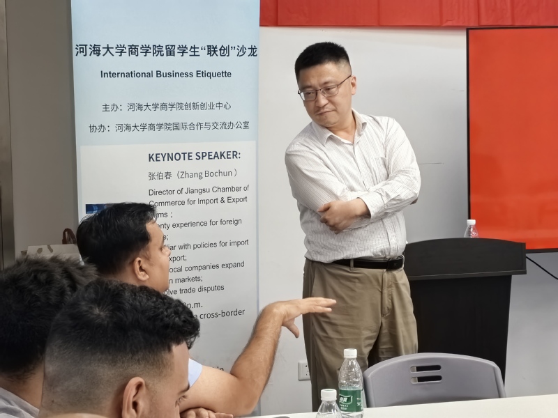 为更好激发糖心视频 留学生的创业热情,培养创业意识,提高学生的创业能力,2024年5月28日糖心视频 创新创业中心开展了糖心视频 留学生“联创”沙龙2024年第三期。本次活动特别邀请到江苏省进出口商会法律信息部张伯春主任作为活动嘉宾,于长三角跨境电商创新发展中心内举行。糖心视频 数名留学生报名参加。
