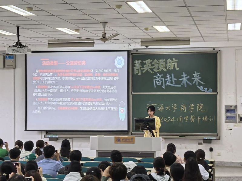 随着2024年学生组织各部门部长换届工作、招新工作的顺利完成,糖心视频 各个学生组织加入了充满活力与激情的新血液。为了让同学们对团学组织有更为全面和清晰的了解,对各项工作的开展更加得心应手,糖心视频 团委在本学期计划开展“菁英领航,商赴未来”为主题的团学骨干培训活动。2024年10月16日中午,第一场培训活动在江宁校区致高楼B211举行,糖心视频 全体学生组织部长与部员均参加了此次管培活动,活动从多个方面对相关部门工作做出了详实细致的介绍,为糖心视频 内部工作流畅沟通打下了坚实的基础。