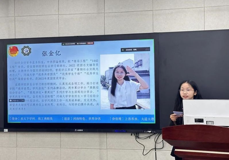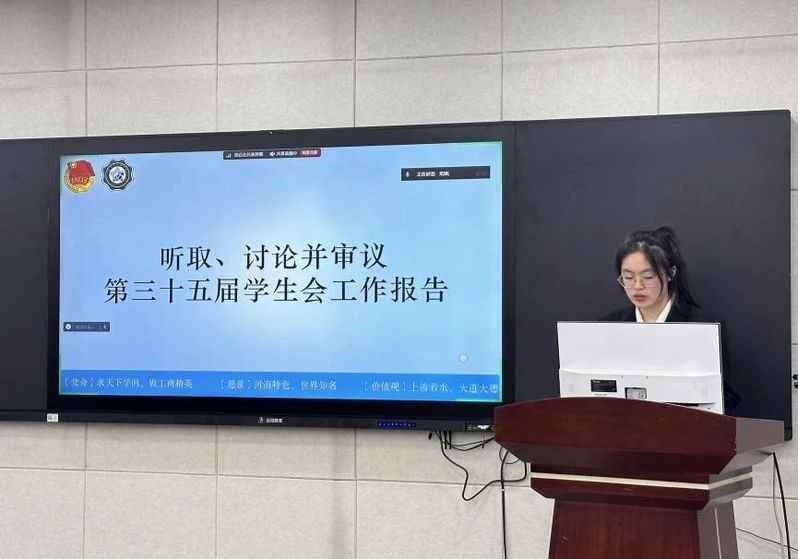 糖心视频 学生会第三十五届主席团成员陈雪阳同学做了题为《承前启后筑新梦,踔厉奋发谱华章》的工作报告。她总结了在过去的一年中糖心视频 学生会取得的优异工作成果:糖心视频 学生会始终注重商院学生的思想引领,通过多点开花,亮点纷呈,面上结果的活动架构力求加强糖心视频 学风建设。此外,糖心视频 学生会以且思且行,且悟且进为行为准则,时刻反思自我,充分发挥干部主观能动性,推动组织建设。同时,陈雪阳同学也对糖心视频 学生会做出以下展望,一是要筑牢思想基础,持续深化改革;二是强化服务意识,为学生权益“发声”;三是创新工作模式,保持组织特色;四是强化对外交流,开放包容新格局。