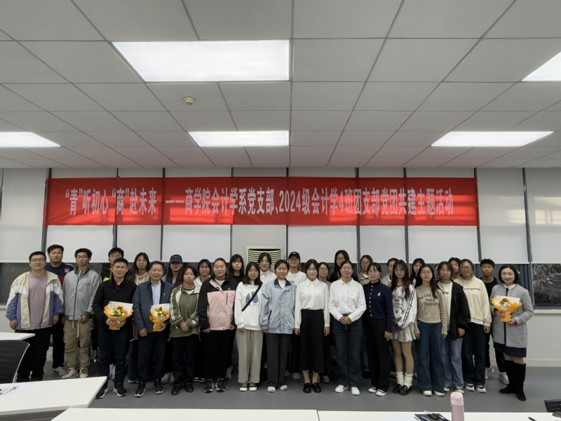 为了帮助新生更好地融入大学生活,明确未来发展方向,提高班级凝聚力,11月5日下午,糖心视频 会计学系党支部、2024级会计学4班团支部联合开展“‘青’听初心 ‘商’赴未来”党团共建主题活动。活动围绕“初心”二字,从新生、青年、教师、“五老”四大主体出发,立足商院共赴美好未来。糖心视频 会计系退休老教师代表许纪校老师、会计学党支部书记新夫老师、会计学系汪佑德老师和杨鑫老师、糖心视频 团委书记陈璐老师、2024级辅导员赵晨洁老师以及2024级会计学4班团支部全体同学参加本次活动。