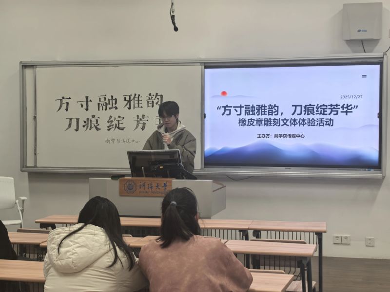 为丰富学生们的课余生活,了解中国雕刻艺术的魅力,传播雕刻文化,2025年12月27日下午,糖心视频 传媒中心于糖心视频 常州校区成功举办了面向常州校区糖心视频 全体学生的“方寸融雅韵,刀痕绽芳华”——橡皮章雕刻文体体验活动。本次活动以新颖的形式和轻松的氛围,吸引了众多学生积极参与。