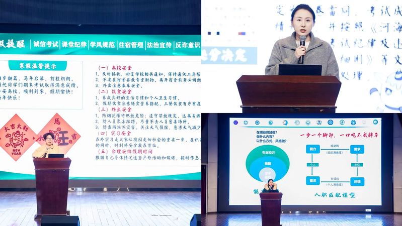 述职结束后,潘佳莹老师上台从诚信考试、课堂纪律、学风规范、住宿管理、法治宣传、反诈意识、寒假提醒方面,对学生日常管理进行强调说明。周子芮老师从与23级的相识展开,从自身的经验出发为大家讲明面对生涯规划、学习压力等困难时的处理方法。史玉莹老师从职业规划出发,从保研、考研、留学、考公、就业等方面进一步讲解了部分了解渠道及注意事项。