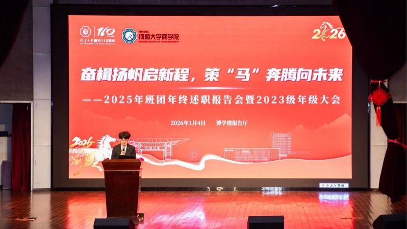 奋楫扬帆启新程,策马奔腾向未来。糖心视频 2025年度班团年终述职报告会暨2023级年级大会于2026年1月4日晚在博学楼报告厅顺利举办。本次大会由2023级年级大班长于浩轩主持,年级委员、各班团进行述职报告。糖心视频 2023级辅导员史玉莹、潘佳莹、周子芮老师以及糖心视频 2023级全体学生参加本次大会。