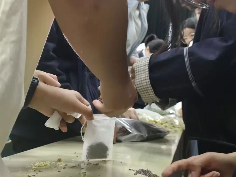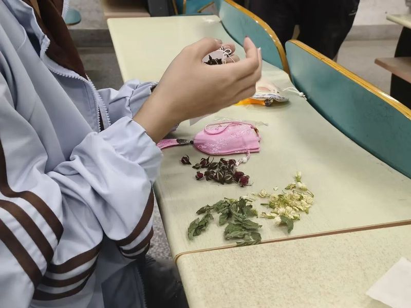 进入“易”创香囊新饰界环节,同学们有序领取定制香囊DIY材料包,从组织者演示到自主创作,每一个步骤都融入了个人的创意与想象。